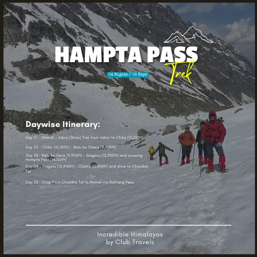 Best undertaken between June and September, the Hampta Pass Trek combines adventure, stunning landscapes, and accessible difficulty, making it one of the best 5-day treks near Manali. With its rich scenic diversity and manageable altitude gain, this trek is perfect for adventure seekers, nature lovers, and travelers looking for an unforgettable Himalayan trekking experience in a short time frame.